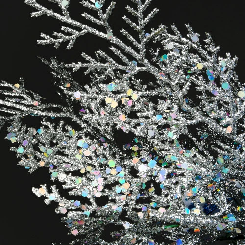 - Trimmed with silver leaves, sprigs, ball ornaments and ribbon